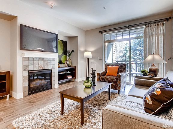 Stylish 2br/2ba ground floor unit in secure Verdeaux complex upgraded with high quality laminate flooring, SS appliances and slab granite countertops. Spacious Master suite offers spacious bath w/ soaking tub and dual vanity; walk-in closet.Gas fireplace,tons of storage space, custom shelving.Private deck overlooking greenbelt setting.2 deeded pkng spots.Secure community garage. Enjoy outdoor BBQ area, tennis court, playground, trails & parks. Amazing Commuter Location - seconds to P&R and I-405