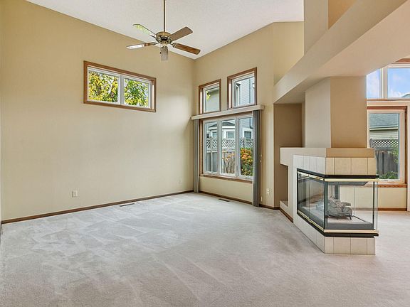 Experience comfortable, low-maintenance living in this beautifully maintained Suncourt home. The spacious living and dining rooms feature soaring ceilings and a cozy two-sided gas fireplace, creating a warm and inviting atmosphere. The kitchen offers both a breakfast bar and a casual dining area, complemented by stainless steel appliances, quartz countertops, a tiled backsplash, and tile flooring.