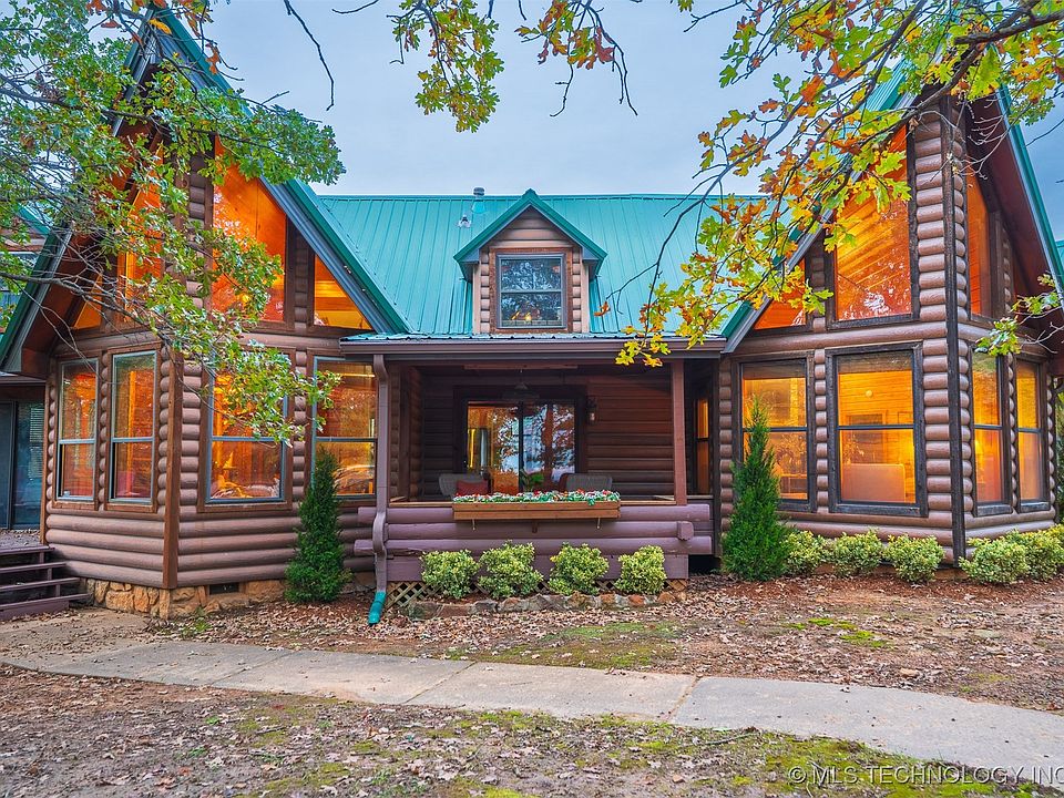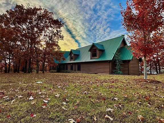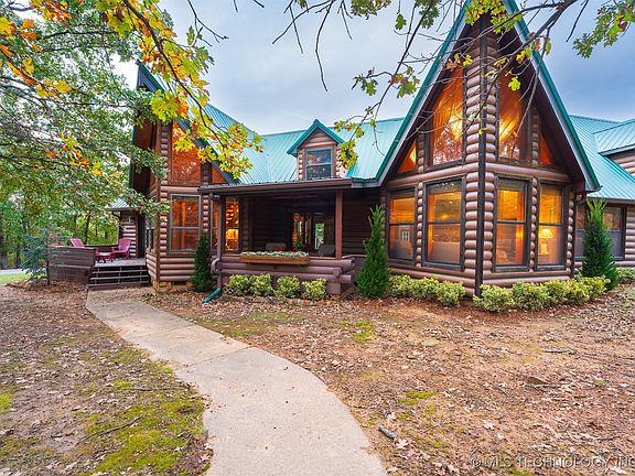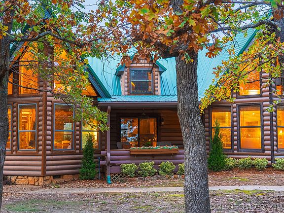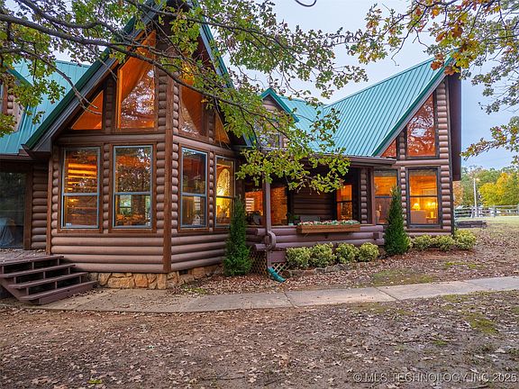 CUSTOM HOME WITH 814 +/- SQFT GUEST HOUSE (CH), 40'x60' RED IRON SHOP, AND STOCKED POND. Set on 10 +/- acres with mature oak trees and panoramic views of Skiatook Lake, this 4,302 sq ft (CH) custom-built log-style home offers a unique combination of space, durability, and style. Constructed with concrete log siding and a metal roof, the main residence blends lasting quality with the warmth and character of cabin living. Inside, the open layout features vaulted ceilings, rich wood finishes, expansive windows, and a stone fireplace that anchors the main living area. The kitchen includes granite countertops, a center island, stainless steel appliances, ample cabinetry, and a wood-burning stove that ties seamlessly into the adjoining dining and living spaces. The primary suite offers two walk-in closets, dual vanities, a soaking tub, and a spa-style shower with dual shower heads and a rain feature. Additional highlights include a safe room, a spacious laundry area with built-in dog wash, and an upstairs bedroom with private bath and flex space that's ideal for an office, guest room, or game room. Just steps from the main home, the 814 sq ft guest house (CH) provides 1 bedroom, 1 bathroom, a full kitchen, and abundant storage. It’s perfect for visitors, extended family, or rental opportunities. Outdoors, the property includes a stocked pond with dock, a 40x60 red iron shop, two chicken houses, a storm cellar, a circle drive, and two electric gated entrances. The land is home to abundant wildlife, including deer and turkey. Conveniently located only 3 miles from Crystal Bay Marina, 8 miles from shopping and dining in Skiatook, 20 miles from Owasso, 24 miles from Downtown Tulsa, and 27 miles from Tulsa International Airport, this property offers privacy with easy access to surrounding amenities. Enjoy the peaceful setting, wildlife, and panoramic lake views from your own private retreat. Buyer’s agents welcome. Schedule your private showing today!