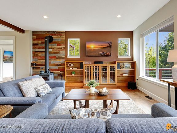 Thoughtfully designed and impeccably maintained, this 10-year young home is situated on over an acre of private, peaceful, and serene land. Deep windows offer a secluded treehouse setting, with the Great Room providing southwest views. The custom kitchen features rustic birch cabinets, 42'' uppers, granite counters, stainless appliances, and raised breakfast bar, opening to living and dining, plusaccess to an expanded deck rough-plumbed for a gas BBQ. The living room boasts custom cherry built-ins and a soapstone wood-burning stove for those cold Alaskan winter nights! A main level 4th bedroom with vaulted ceilings doubles as a family/flex room. Upstairs enjoys 2 addt'l bedrooms + private master retreat with double vanity, walk-in shower, soaking tub, and private balcony. And enjoy 1064 SF of garage/shop/storage space for parking, for all your Alaskan things, and to tinker -and wired with a generator capabilities to cover the garage, furnace, well, kitchen, and living room outlets.