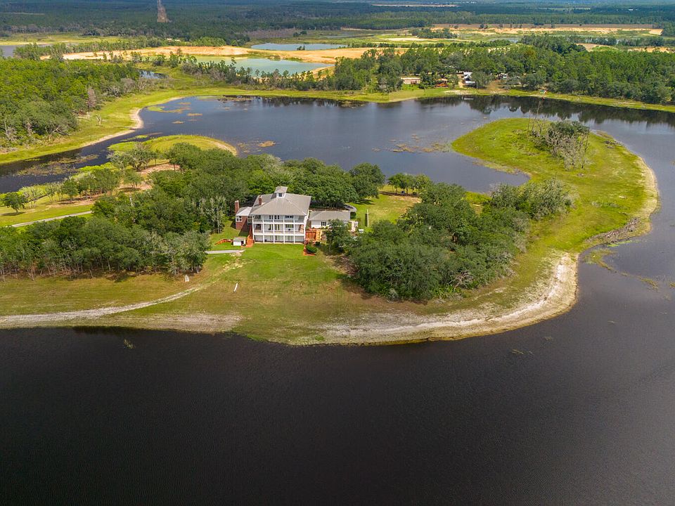INCREDIBLE Lakefront Estate on 32 Acres with 360 Water Views! Nestled just north of Panama City, Florida, this extraordinary 32-acre estate on freshwater River Pond is a remarkable gem. As you enter this lakefront estate, you're greeted by a scenic 100+ year oak tree-lined road leading you to a stunning 7,200 sq. ft. Southern-style home, perfectly positioned on the end of a peninsula offering breathtaking 360-degree lakefront views. Additional acreage available for sale with purchase. Designed for both luxury and function, this 5-bed, 5-full bath, 2-half bath residence boasts show-stopping wrap-around porches on all levels, mother-in-law suite, & incredible 10-foot ceilings throughout all three levels. Two upper levels at 4,000 SF, walk-out basement at 2,000 SF, heated/cooled storage at 1,200 SF. Enjoy the ease of access with a full-size elevator, making every part of this home effortless reachable.