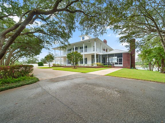 Built solid with poured concrete construction, this fortress of a home on the lakefront is as durable as it is breathtaking, with classic white horizontal clad siding and red brick accents completing its timeless Southern charm. As you sit on the porches from all sides, you're mesmerized by the shade the stunning oak trees offer and the charm that Spanish moss provides. This property has been impeccably maintained by its original owner and no detail has been left untouched. Remarkable landscaping spans the entire property so you can enjoy every aspect of this lakefront retreat. Don't miss this rare opportunity to own a luxury waterfront estate encompassing the entire peninsula on a lake!