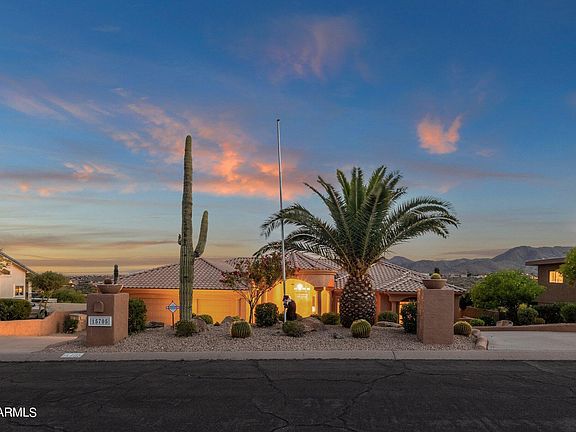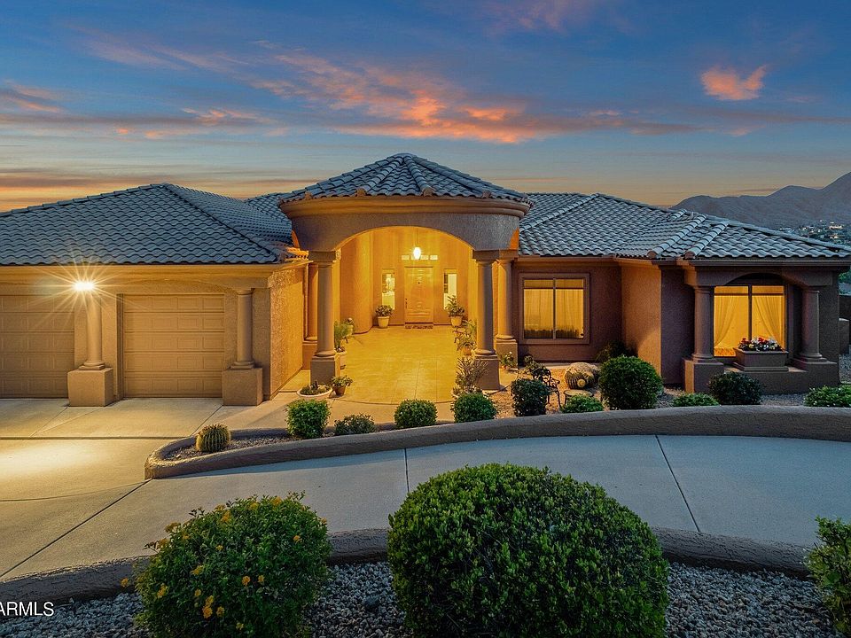 From the moment you step inside, breathtaking panoramic mountain views captivate your senses through expansive windows. Stunning 5-bed, 4-bath retreat on 0.51 acres. single-level living w/ lower-level bonus suite and 2nd master bedroom. Luxe primary suite w/ spa bath. Private pool, heated spa, huge veranda, no HOA. 3-car garage, central vac, water softener, new HVAC. Near McDowell Mountains