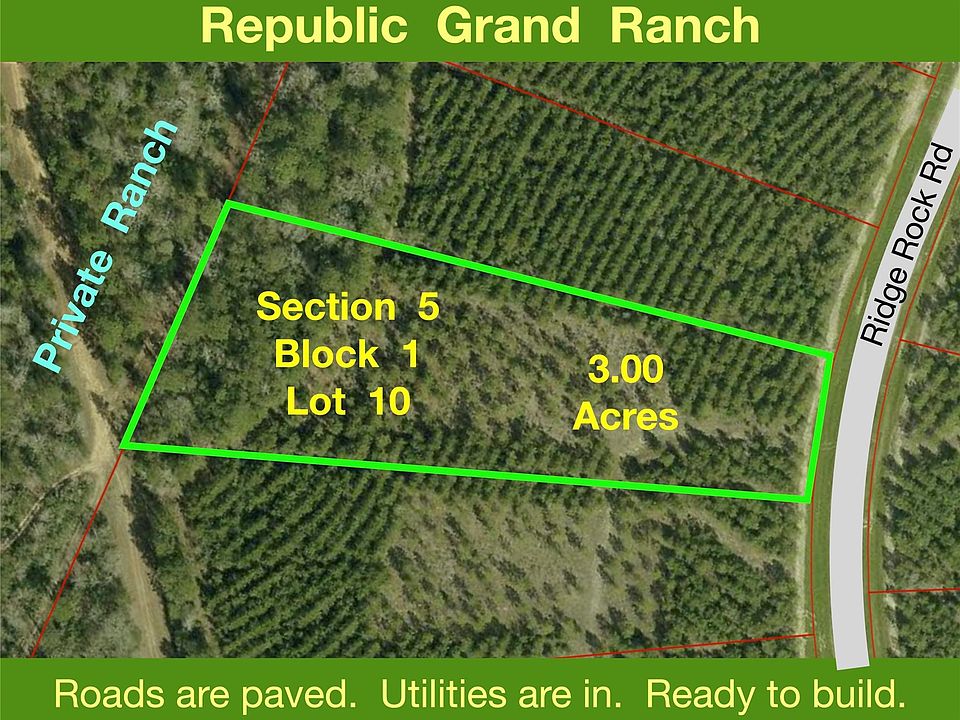 3.00 ACRES > UNDERBRUSHED IN THE MIDDLE - THICK BUFFER OF PERIMETER TREES FOR MAXIMUM PRIVACY > Located on the outskirts of Willis with great schools and nearby shopping. Large lot wooded community with gentle rolling hills. Peaceful privacy. You will never be crowded by neighbors. Republic Grand Ranch is a large lot, wooded community in the rolling hills. Country lifestyle for your custom forever home. Trees, paved roads, water, HIGH SPEED fiber optic internet & underground power through out. Covered pavilions, parks, ponds, playgrounds, BBQ areas. Minutes from shopping, dining, schools, hospitals, and entertainment. Low taxes - No MUD tax. Average elevation is 400’ ASL. Plenty of greenspace and trails for hiking, biking and horseback riding.