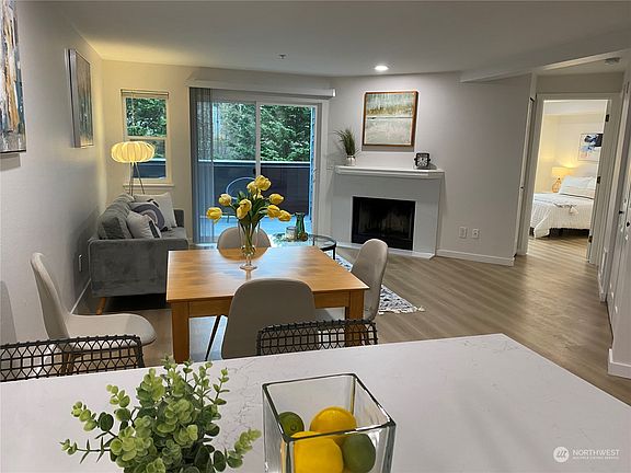 Envision your new life in this ideally located and refreshed 1BR/1BA condo nestled in the heart of the desirable Juanita/Bothell area. Step into a welcoming open floor-plan that seamlessly connects the living, dining, and kitchen areas. Recently refreshed with new kitchen cabinets/Quartz counters, freshly painted interior and new luxury vinyl plank flooring throughout. Enjoy outdoor moments on your private patio or warm up your winter evenings sitting by the wood burning fireplace. Parking includes a single car garage and a designated parking spot (#53). The community features a clubhouse, sports court, and an exercise room and even free RV parking.
