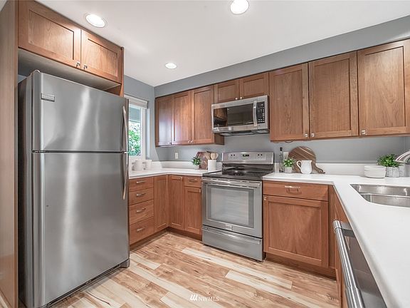 Amazing location - Beautiful ground level condo near trails & parks! Inviting patio welcomes you to modern kitchen featuring Corian countertops, entertaining breakfast bar & high-end Canyon Creek cabinets. Enjoy your spacious living room w cozy wood fireplace & balcony overlooking green belt. The bright primary is a show stopper w vaulted ceilings, generous closets & ensuite. Second bedroom has balcony - great light for the work from homers. Convenient half bath & laundry on main. 1 car garage + parking space & guest parking. Exterior reno underway - new siding, paint, windows, decks & railings complete '22 - NO Assessment & NO Rental Cap! No FHA. Up to 3 fur babies allowed. Centrally located near 522, I5 & downtown Bothell. Come see today!