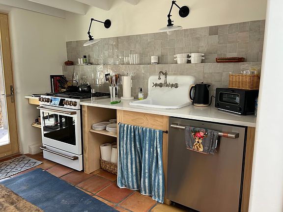 Owner pays for utilities including water, gas and trash; tenant reimburses flat fee of $200 for all of the utilities plus free Wifi. 7 month lease is ideal but term is flexible. The garage is great for storage and is available for $250 extra per month. The last two pictures are of a casita next to the house that is also available as a studio and guest room for 1,400/month all utilities included.