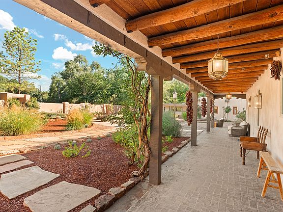 Private and gated compoundStone pathwaysEntry courtyardLush village of tesuquePlastered wallsSitting portalsVast tree-lined views