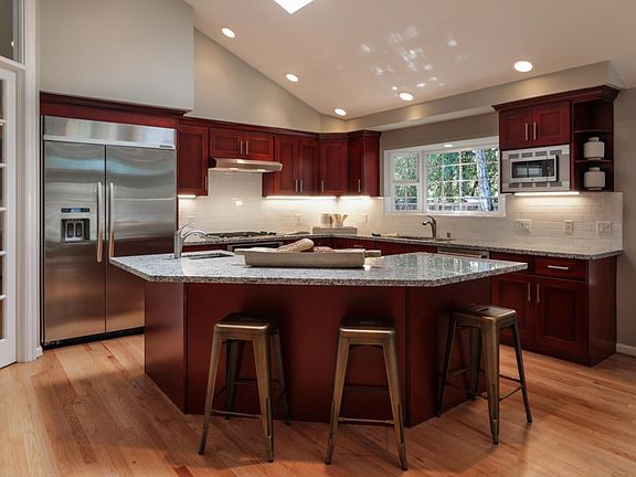 Beautifully expanded/remodeled, home is paired with a large lot with for the best of indoor-outdoor living! Superb location is just minutes away from Los Altos Village dining/shopping venues, Apple, & Silicon Valley employers. Quality remodeling includes high ceilings, custom arched windows, & rich hardwood flooring. Large, remodeled kitchen has cherry cabinetry with granite slab counters, center island with breakfast bar & prep sink, pantry, 4-burner gas range, large Subzero refrigerator, soaring ceiling with skylights, & spacious eating area with bay window. Open from the kitchen, the family room has a fireplace, built-in media cabinetry with flat screen TV, & French doors to a rear patio. Luxurious master bedroom offers a cathedral ceiling with recessed lighting, patio door to the rear yard, & hardwood flooring. Sumptuous master bath has dual vanities, jetted tub, shower with clear glass enclosure, walk-in closet with organizer, skylight, & French door leading to the rear yard.