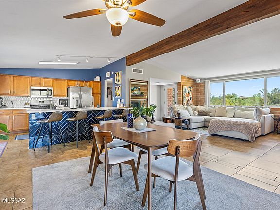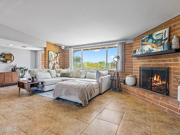 Casas Adobes Midcentury Modern Burnt Adobe Ranch sits on .83 acres. Bright & open great room with fireplace. Updated and well kept 3 bedroom / 2 bath. Tile flooring throughout. Low E dual pane windows. Dreamy covered patios on the east and west to enjoy sunrise and sunsets. Natural desert landscape with mountain views, Private enclosed backyard with gorgeous metal fence. NO HOA! Two car attached carport with storage & laundry shed.