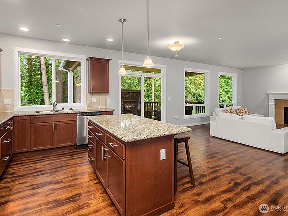 This captivating custom design takes premier position on a private .64 acre homesite. Dramatic architectural lines and a brilliantly designed volume of space create an inspiring atmosphere. Ideal, open floor plan lives seamlessly. Spacious primary bedroom features a vaulted ceiling, huge walk in closet, and sumptuous bath with soaking tub and shower. Kitchen is adorned with all the favorites, including pantry, island, and plentiful cabinet space. Spacious family and dining rooms. Covered entertainment sized deck with gas fireplace steps down to back yard and into the serenity and beauty of a wooded greenbelt. Large bonus room + bedrooms. Bedroom on main is perfect guest suite or office and has separate entry door. Big 3 car garage!