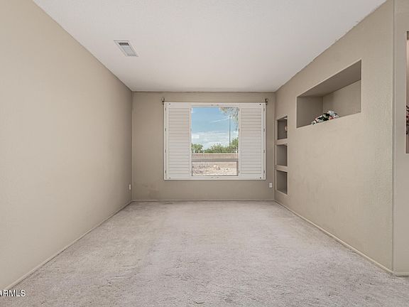 Discover this charming 3-bedroom home in Sun City Grand! All the space you need 3 bedrooms, 3 bathrooms & a 2-car garage with attached storage! Inside, you'll find spacious and bright living areas showcasing tile flooring, carpet in all the right places, plantation shutters, and neutral paint throughout. The family room features a fireplace and surround system, making it perfect for cozy movie nights. The impeccable kitchen boasts oak cabinetry, a peninsula, and built-in appliances for a seamless cooking experience. The primary bedroom has a lovely bay window, a bathroom with double sinks, and a closet. The third bedroom is ideal for guests or an office, as it has a separate exit and a built-in desk with shelves. The backyard is complete with a covered patio perfect for quiet evenings and weekend grills, and a low-care landscape for easy living! Come see it before it's too late!