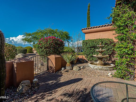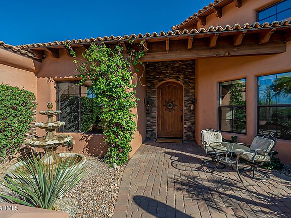 This is an Eye Catching Spanish style Sunridge Canyon Custom home, This home sits hillside but since the hill is in the back it not only has a flat driveway & courtyard but the whole home lives on one level inside. This sprawling floor plan has split bedroom living spaces which gives optimal privacy to those living within the home. There's plenty of room for two in-home offices without losing the guest bedroom space. The gourmet kitchen is the Hub of the home w/ Granite counters, Dacor and Bosch appliances, 6 burner Gas cooktop, Sub Zero refrigerator, warm wood cabinets and a spacious Island. The FR. and the LR. are just off the kitchen which makes for a fabulous entertaining space. The Lg. owner's suite is private with patio access for an evening of stargazing or a quick dip in the POOL The spa inspired owners bathroom has 2 sep. Exec. hgt. vanities, private commode area, jetted tub, private shower and a walk-in custom closet. There's a Beautiful custom office near the owner's suite with B/I wood bookshelves & a walk-in closet. The 3/4 hall bath has pool access and a zero grade entry shower. Guest room #1 is separate and has an en-suite bath w/ a private patio and pergola. Guest rooms 2 & 3 have a Jack & Jill bath between, one is currently set up as a theater room, and the other has patio access with a walk-in closet. Plus, don't miss the BONUS room off the laundry room which could be another office, a workout room, art studio, etc. The backyard is artistically laid out and designed to capture the gorgeous Four Peaks Mountain views. The beautiful covered patio has a wood ceiling, stone accents, and a built-in grill. A few steps down will take you to the stunning sparkling waterfall pool and the stone fireplace. There's also a spacious side yard and backyard that has artificial grass for the fur babies and kids to play, or it could be a great spot to add a putting green. The 3-car garage has a Trane AC mini split installed and plenty of Built-in storage. There's also a full home water filtration system. This unique custom home has so much to offer; schedule your private showing today.
