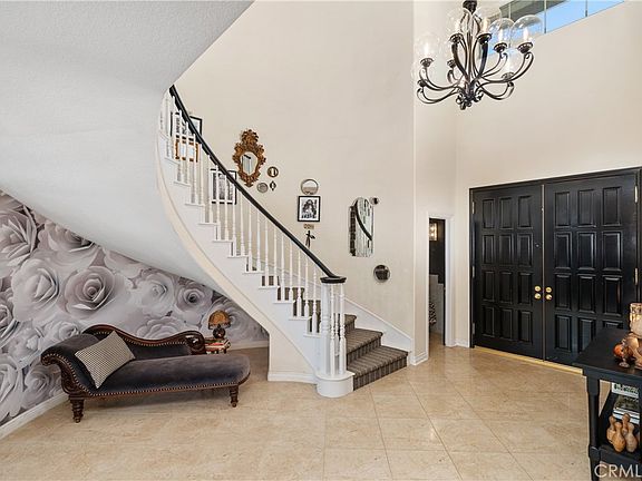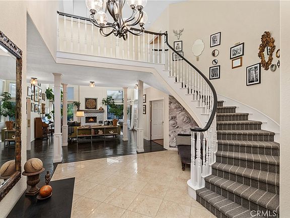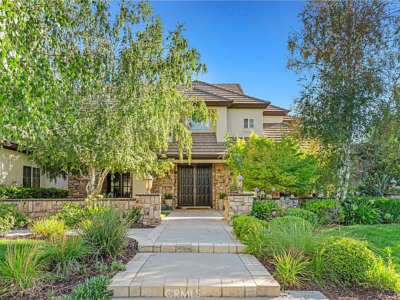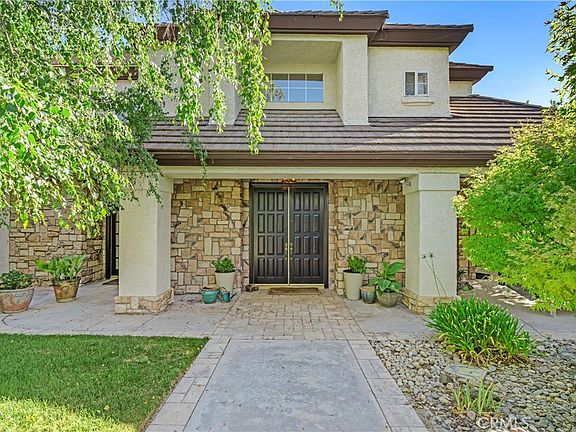Beautiful 5 bed/5 bath home with over 4100 sq ft of living space in Santa Clarita, over an acre on land. Enter the foyer with high ceilings and carpeted spiral staircase, with a lovely sitting area under the staircase, which would also make a great wine closet or storage space. The current owners have added crown molding throughout the home. The living room is complete with large windows looking out to the spacious yard, and a gas fireplace with reclaimed wood mantle. The dining room has a quaint library feel to it. One bedroom downstairs is en suite with a separate entrance to a side patio. The kitchen is a cook and baker’s dream, with recessed lighting, farm sink, black quartz countertops, white subway tile backsplash, bead boarding to accent some of the cabinets, newer appliances, including double stove and range. There is a gas/wood fireplace in the eating area/great room looking out to the backyard. Great room off the kitchen for family and friends to gather for game night or to enjoy a fire. What house would be complete if not for a butler's pantry and a baking closet….