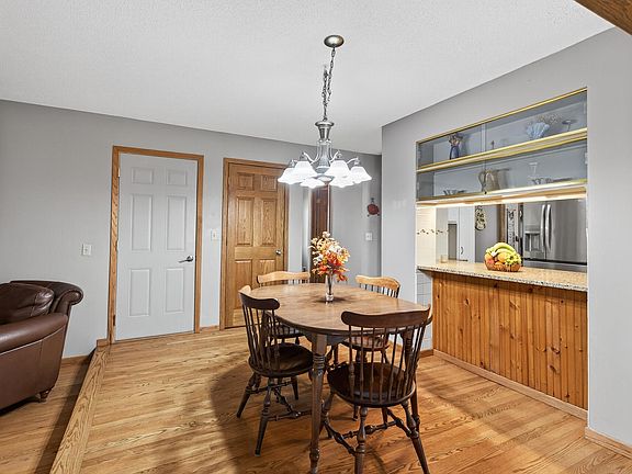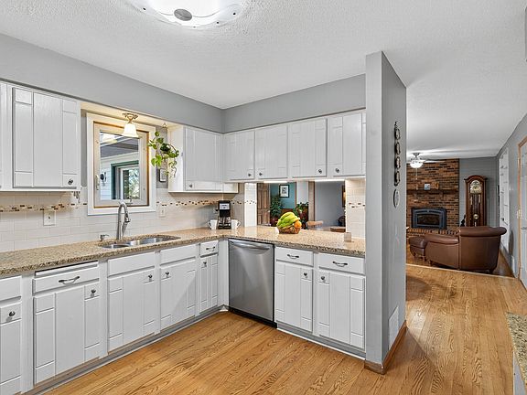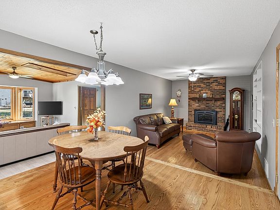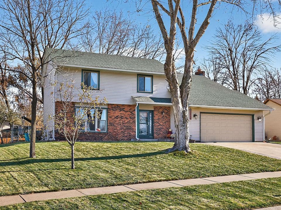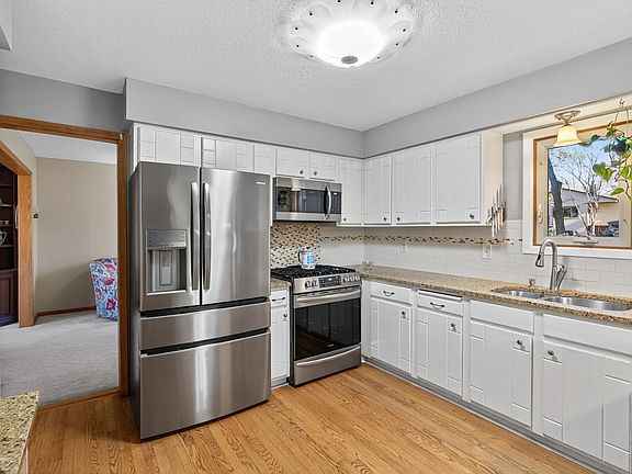 Oh wow! Welcome home to a beautiful, open, expanded, & updated 2-story w/ a large, fenced backyard on a quiet street close to the heart of Apple Valley. Step into hardwood floored entry adjoining a formal dining room that opens into a walkout living room - both flooded w/ sunlight light from a wall of newer windows on the West & a sliding glass door to the East. Cook in a kitchen w/ real hardwood floors + updated w/ timeless white cabinets, stainless steel appliances (including a gas range), granite counters, & a breakfast bar that opens to the informal dining room which flows into a family room - w/ a brick surround gas fireplace + also w/ hardwood floors. Relax or entertain in the warm & bright sun room addition w/ vaulted ceiling, heated floor, new windows, & a skylight for extra sun. Sleep in 1 of 4 upper-level bedrooms - including a primary w/ a private 3/4 bath & 2 roomy closets. A partially finished lower-level rec room means expanding is a cinch. Enjoy nature w/ a fenced backyard w/ in-ground sprinklers featuring a large deck, garden bed & storage shed. Young roof (2023) as well. A beautiful & rare opportunity to make this your home.