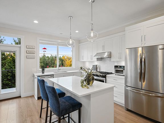 Welcome to Olivia by Woodbridge Properties – Luxury Living in Grandview! Stunning 4-bed, 4-bath townhome with 2,000+ sq.ft. of modern, open-concept living. Main floor boasts 9ft ceilings, spacious living and dining areas, and a convenient powder room. Gourmet kitchen features quartz countertops, gas range, and gallery appliances. Large balcony with BBQ hookup and amazing views. Upstairs has vaulted primary bedroom with WIC and ensuite, alongside two additional bedrooms, a 4 piece bathroom, and a side-by-side laundry room. Versatile 4th bedroom or flex space below. Additional highlights include A/C, hot water on demand, double garage with driveway parking, and thoughtful upgrades throughout. Conveniently located near Morgan Crossing, Grandview Corners, Morgan Creek Golf, & top schools!