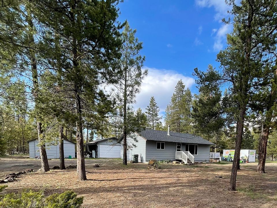 Are you looking to get away from traffic and noise, either permanently or as a weekend escape? This cozy cottage tucked in the woods on 1.25 acres is ready for some TLC and has plenty of room for your toys! The home is 925 square feet, 2BR/1BA, with newer carpet, vinyl flooring, and wood ceiling tiles. Vinyl windows added and roof replaced in 2017. Two detached garage buildings with power, wood shed, and separate laundry building. The wood stove will keep you warm in the winter! Seller is working on paint touch-ups and yard cleanup--otherwise home is being sold AS-IS. Put your finishing touches on it and make it your own! Just a few minutes off Burgess Rd. with easy access to Hwy. 97, La Pine, Sunriver, and tons of outdoor activities in the area. Home comes with a 1-year First American home warranty.