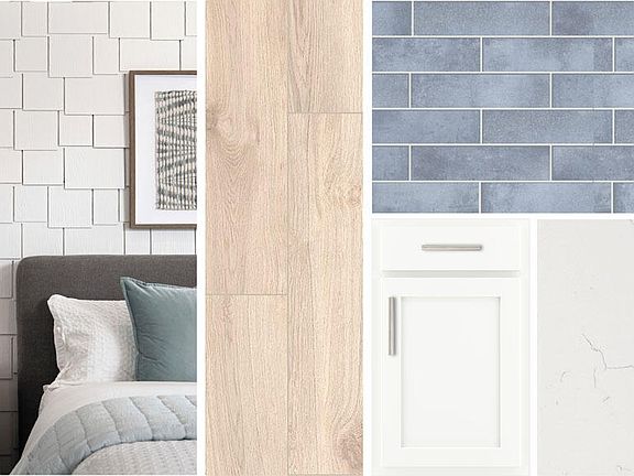 The heart of the home—the kitchen—shines with selections from the Coastal Collection, including 42'''' white cabinetry, chrome hardware, Crisp Stria quartz countertops, and a light blue tile backsplash that brings a fresh, coastal-inspired elegance. Throughout the main living areas, 8''''x36'''' plank tile flooring combines durability with modern appeal, while soft carpeting in the bedrooms and den adds warmth underfoot.