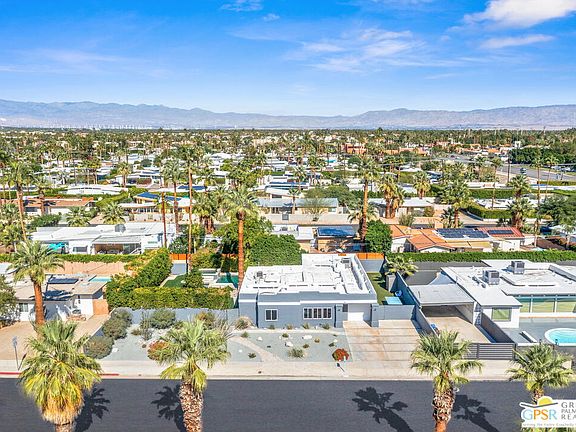 This contemporary home in the desirable Tahquitz River Estates neighborhood of South Palm Springs features three bedrooms, two bathrooms, a saltwater pool and spa in a private backyard, and sweeping mountain views. The entry opens to a spacious living room with a gas fireplace, flowing into a kitchen equipped with a commercial-style range and generous storage and counter space. A den and dining area sit just beyond, completing a layout that's ideal for both everyday living and entertaining. A converted one-car garage houses the washer and dryer and provides flexible space for an office, gym, or storage. The roof has recently been upgraded with 1.5 inches of foam, and the exterior has been freshly painted. Drought-tolerant landscaping and synthetic turf complete the clean, low-maintenance outdoor setting. The home offers convenient access to Downtown Palm Springs, shopping, dining, and essential services.