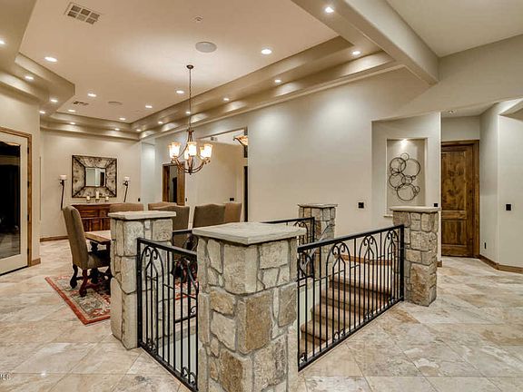 Santa Barbara/Tuscan home on 1+ Acres. Panoramic views of McDowell Mountains, 4 Peaks and the Fountain. A welcoming open entry to a large open gourmet Kitchen with island, Six-burner Wolf Cooktop, double ovens, Pot Filler faucet, buit-in warming drawer, dishwasher and microwave. Kitchen opens to large family room with stone gas fireplace with access to large patio with incredible views. Large master with views and 4 additional on-suite bedrooms. Lower level has family great room, built in bar, game room, theatre room, wine room with large balcony. Fantastic backyard including built-in BBQ, fire-pit, heated pool/spa and sports court. Enjoy Arizona Living at its Best!