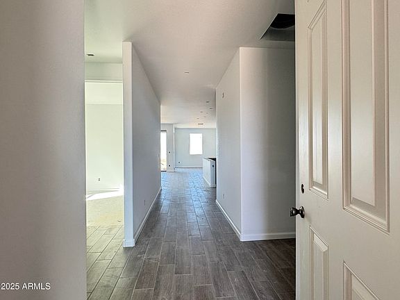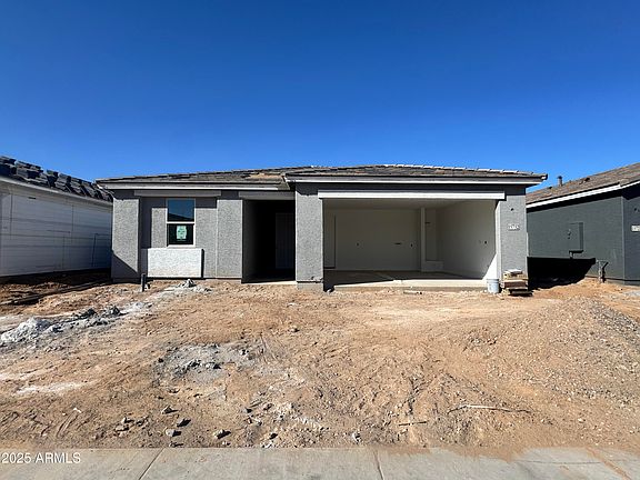 Additional highlights include 7 "x 22 " plank tile flooring in the main living areas, plush carpeting in the bedrooms, and a paver driveway and entry that enhance curb appeal. Thoughtful upgrades such as a soft water loop, blinds, and a garage door opener ensure effortless move-in readiness. The covered patio, accessible through the 4-panel sliding glass door, invites you to enjoy Arizona's beautiful weather year-round.
