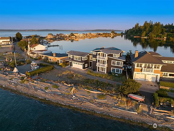 Custom designed Cape Cod waterfront home with 360 degree water views of the Olympic Mountains and Cascades from every room. This home enjoys 108 feet of waterfront with both sandy Puget Sound access as well as a boat launch on the lagoon. Ever changing wild life and boat activity is your daily entertainment. Easy kayak launch from your own beach and the crabbing is great! Multiple decks to enjoy entertaining. Open floor plan on the main floor with 2 fireplaces. The primary suite is the entire upper level with elevator access. Cooks delight kitchen with high end appliances and large prep island. In floor radiant heat. Exterior painting just completed, Solid home built by Jerry Reese Construction. 2 car garage for plenty of storage.
