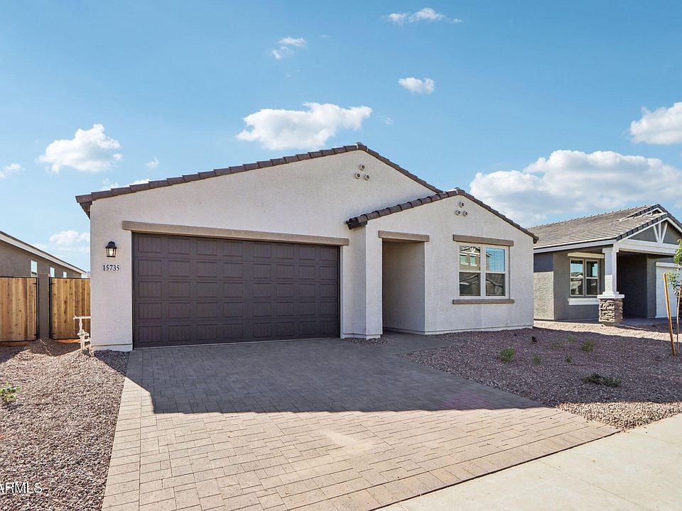Discover the highly sought-after Larkspur floorplan at Stonebridge Manor, a beautifully designed single-story home offering 1,949 sq. ft. of modern living space. This home features 3 spacious bedrooms, a versatile den, and 2.5 bathrooms, seamlessly combining functionality and comfort. The expansive great room boasts 8' interior doors and a stunning 4-panel center sliding glass door, creating a seamless connection to a generously sized backyard—perfect for entertaining or relaxing. At the heart of the home is a chef-inspired kitchen with 42'' Gray Shaker cabinets, elegant White Sand cquartz countertops,Satin Nickel hardware, and a stylish 3x12 backsplash. A full suite of GE stainless steel appliances, including a refrigerator, electric range, microwave, dishwasher, plus a white washer and dryer, adds everyday convenience. Durable 6x36 plank tile flooring runs throughout the main areas, with plush carpet in the bedrooms and den for added warmth. Additional upgrades include 2" blinds, a soft water loop, garage door openers, and paver accents at the driveway and entry, enhancing the home's curb appeal. The Larkspur is truly a perfect blend of style, comfort, and easy livingready for you to make a home.
