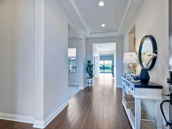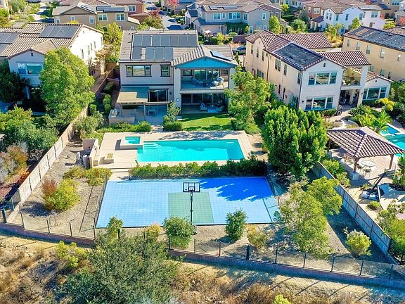 Welcome to this stunning 5 bedroom, 5.5 bath home in the coveted community of Del Sur! Walking through the dramatic entry, high ceilings and rich wood flooring frame the open sightlines through the home to the backyard pool and hills beyond. A front of house bedroom and bathroom are perfect for guests or single level living. The light filled office has a side patio view and is an easy flexible space. The dining room can accommodate a large gathering and a sliding glass door to the side patio adds to the open feeling of the room.