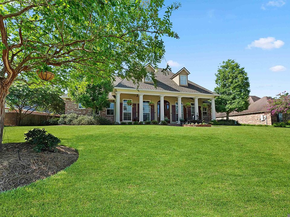 This stunning custom-built home is located on one of the most desirable lots in Green Trails at Shenandoah. Designed with classic Louisiana charm, you are welcomed by a front porch with stately columns and custom landscaping that sets the tone for the elegance inside. Step into a spacious open living area with rich Brazilian wood flooring, and a brick accent wall featuring arched openings that seamlessly connect the kitchen and living room. Just off the foyer is a formal dining area connecting to a butler's pantry ideal for entertaining. The kitchen is beautifully equipped with Northern White Maple wood cabinetry, Crema Bordeaux granite countertops, Travertine backsplash, stainless steel appliances, a five-burner gas cooktop, wall oven, microwave, and a large center island. The living room includes a gas fireplace surrounded by built-ins. The expansive primary suite offers a jetted soaking tub, custom walk-in shower, dual vanities with Dark Emperador marble, and a walk-through closet complete with built-in shelving and drawers. A designated home office with stained Louisiana cypress built-ins provides the perfect space for working. The backyard is truly a retreat, featuring a covered patio area with a cypress pergola, salt water pool surrounded by flagstone decking, a complete outdoor kitchen, and extra green space for relaxing and gardening. This home has a new roof (2023), new whole house generator (2023), a new Carrier AC Unit (2025), and a new salt chlorination cell for the pool (2025). This single-owner home offers luxury, comfort, and character in one of the area's most desirable neighborhoods.