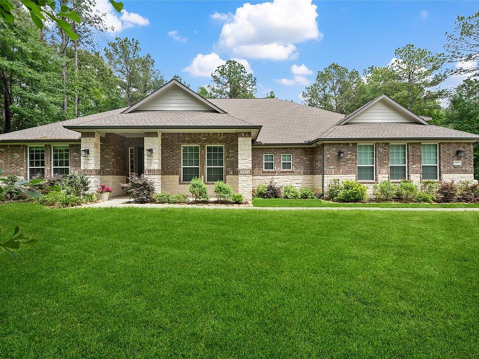 DH Home 1 story Riverside B Elevation on 1.5 acre/wooded w/Small Pond! Brick/Stone Ext. Spacious 1 story Open plan, high ceilings w/Fireplace focal point *Designer selected Lam. Wood flooring throughout *Granite C-tops huge walk in pantry *Back Covered Patio overlooking picturesque wooden scenery; Water Well/Septic/Sprinkler System *gutter leaf blocking system Study & Game RM; Free Standing Tub in Primary Bath! Reverse osmosis system Magnolia Schools *Nearby Infrastructure, including Shopping & Medical Facilities!