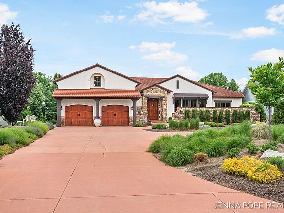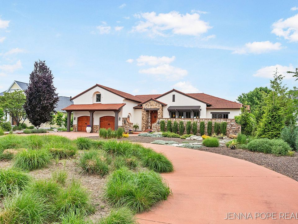 Welcome to your dream luxury estate, situated on the tranquil Grand River, boasting 117 feet of frontage. As you step inside you are greeted by an exquisite hand-carved mahogany antique balustrade overlooking the grand living area. Bask in the splendor of soaring cathedral ceilings complimented by hand-scraped oak floors, pillars and stone accents. The gourmet kitchen is a chef's paradise, complete with gleaming granite countertops, a generous center island, and top-of-the-line Wolf appliances. An elegant dining area opens via French doors to a beautiful brick and stone patio complete with a private garden. Entertain in style on the heated outdoor veranda for multi-season enjoyment, at the terrace kitchen or for a game of bocce ball on the regulation size court out front. The outdoor kitchen is an entertainer's dream encompassing an Italian wood-fired oven, cooktop, grill, and tap station. This home displays elegance, sophistication and functionality. Featuring 5 bedrooms, 5 baths with private suites, walk-in closets, oversized solid oak doors, balconies with IPE decking built to last for decades, a new tankless water heater, Pella windows throughout and a robust 80-year metal roof. Your spectacular riverfront paradise awaits!