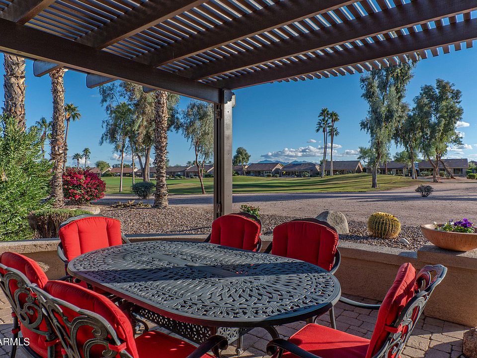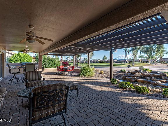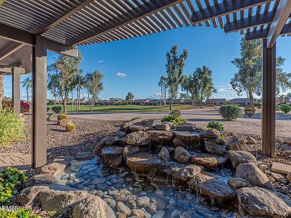 Meticulously maintained home on beautiful golf course lot with views of mountains, green & tee box. SOLAR, NEW ROOF (underlayment) & NEW A/C. Backyard is designed for ultimate entertaining featuring an expanded patio w/ pavers & relaxing water feature. Private courtyard entry with pavers & water fountain. Great room has built in media wall & expansive windows to enjoy the views. Kitchen has an abundance of cabinets, pull out shelving, rich quartz counters & stainless appliances. Primary suite has quiet sitting area, large walk in closet, updated shower & dual vanities. 2nd guest bdrm w/ walk in closet, full bath, large utility room & home office w/ plenty of storage complete the main floor plan. Casita/3rd bdrm with separate outside entrance & bath. Ext. garage has addtl storage.