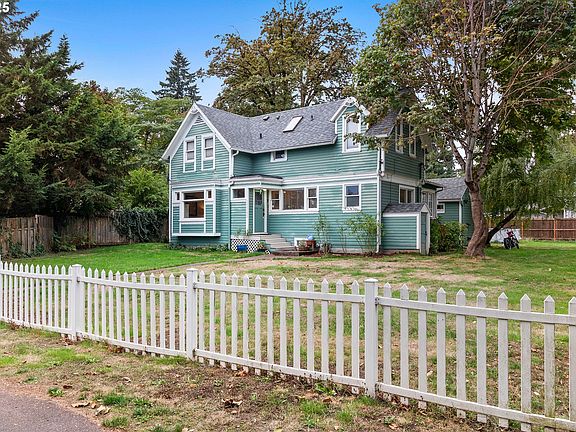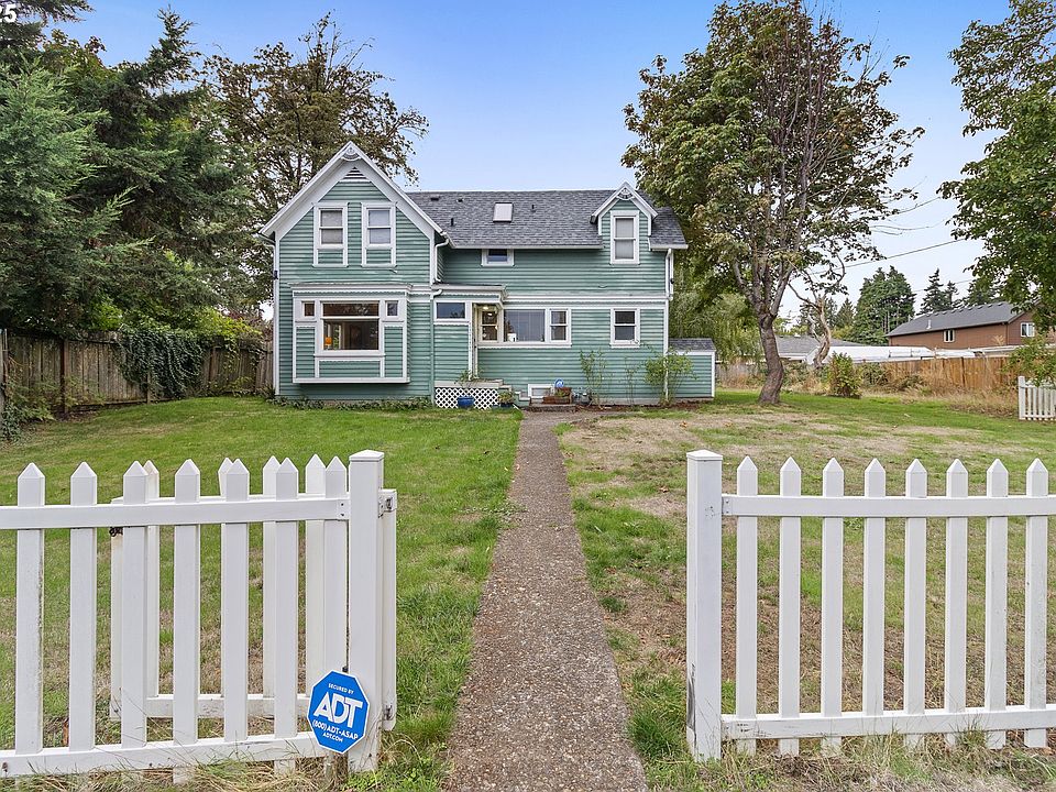 Step into timeless character and country charm with this beautiful 1900-built farmhouse, offering the perfect blend of historic detail and modern updates. Situated privately on a large, level .4-acre lot, this inviting 3-bedroom, 2-bath home sits back from the road, with a peek-a-boo view of Mt. Hood from the kitchen windows framed by tall old-growth trees. Inside, you’ll find original built-ins indicative to the era with window bench seats maximizing natural light and cozy seating, fir wood floors and beamed ceilings. The updated country kitchen and dining area blend rustic charm with modern convenience, offering stainless steel appliances, pantry, and upgraded electrical and plumbing. A laundry room with washer/dryer hookups connects to an enclosed sun porch with beautiful windows, extra storage, and space for indoor plants — plus a pet cubby door for furry friends. The main-level bath includes a claw-foot tub, corner sink, and original built-ins, while the upstairs bathroom has been remodeled with a skylight and subway-tiled walk-in shower. Additional space includes a partially finished basement and a detached shop, ideal for storage, hobbies, or projects. Outdoor living shines with raised garden beds, trellises draped in mature wisteria, stone laid patio with a firepit, and an above-ground pool (included). The U-shaped driveway with parking area provides easy access and ample space for RVs, boats, or multiple vehicles. The fully fenced yard offers privacy, open space, and garden potential. This 1900 farmhouse combines timeless character with thoughtful updates — a rare find that feels like home. Sold As-Is.