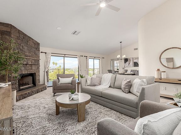 This dream retreat in the desirable Cholla Drive area of Fountain Hills has a great floorplan! This custom double door entry 4-bedroom, 4-bath, 3,192 sq. ft. home features sweeping desert and fountain views from the main-level and lower-level covered patios that span the entire length of the home. Inside, enjoy two stunning stone fireplaces, plantation shutters, and a beautifully updated kitchen, bathrooms, carpet, and interior paint—truly move-in ready. Relax by the sparkling pebble-sheen pool while soaking in the serene surroundings. A spacious 2.5-car garage adds convenience, and the home's flexible layout makes it perfect as a private retreat. Located in a super neighborhood just minutes to Fountain Park, dining, golf, and hiking!