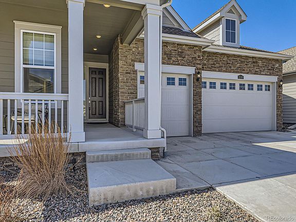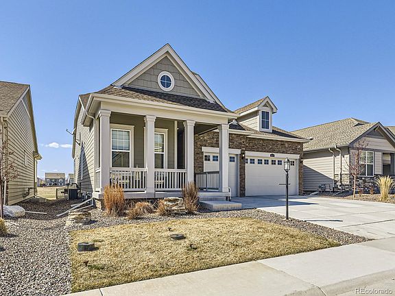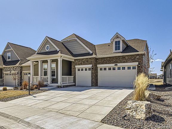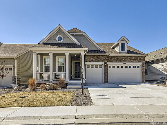 Welcome to model home living in a fantastic & prestigious active adult community of Heritage Todd Creek. This home has been meticulously maintained & decorated beautifully. The custom features abound. There is professionally installed shiplap in the entry corridor along with beautiful custom lighting to accent the tray ceiling. Your guests or other residents will love the front bedroom with private ensuite. The beautiful wall enhancement will catch your eye upon entering. The stairwell has a large custom mechanized window treatment. The kitchen & family room are perfect for entertaining - an eat-in island & open concept brings all the guests together. Picture yourself enjoying the big game on the TV & guests mingling in the family room, dining area & out on the deck. You'll love filling your custom closet with your belongings. Watch the golfers enjoy the course from the covered deck or sitting around the plumbed fire pit. There is luxury vinyl flooring throughout the living areas. Custom lighting, wall embellishments & mechanized window treatments show an attention to detail & decor second to none. The professional landscaping is perfect for ease of care - the backyard has artificial turf, exterior lighting on timers & a wrought iron fence for your littles. All window wells have custom well covers. Addt'l stone veneer was added to the front & the back. Enjoy the fire pit, plumbed grill or the large covered deck while watching the golfcart parades each holiday. The garage has been insulated, drywalled, textured & painted, It has beautiful epoxy floors & an added spigot for convenience.