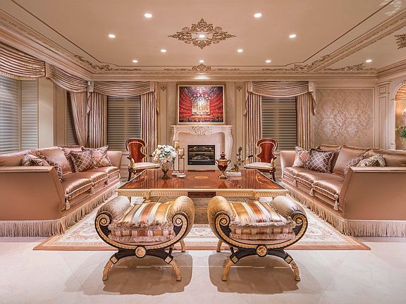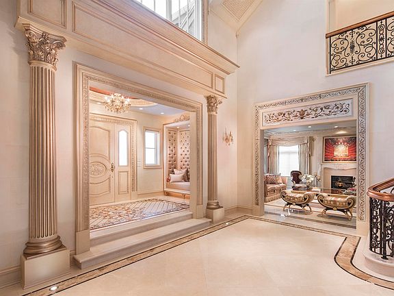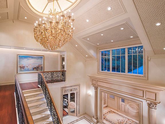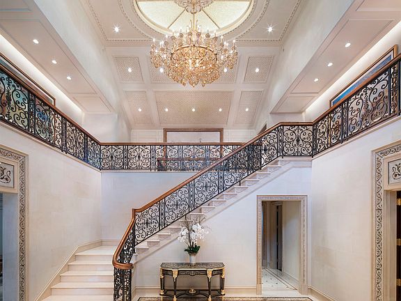 Majestic marble stairsOpulent grand classic masterpieceElegant marble floorsDramatic birds-eye walnut burlMural paintingsBack-painted glass panelsGold-leaf wainscotting accents