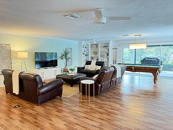 Come see this home in person to appreciate all it has to offer! As you drive up to the Slocum Christian-built residence in Marco Island's prestigious Estate Area, you will be greeted by the beautiful landscaping and new flat tile roof, all on a generous half acre lot. As you pull into the large driveway past the custom egret mailbox, you'll immediately notice the extra detached garage which increases the number of garage spaces to 4. Making your way inside, a very spacious living area along with 4 large bedrooms and 3 full bathrooms provides plenty of space for families and entertaining. You won't want to miss this fully furnished and exquisitely updated home - impact windows on the front and electric shutters on the back, porcelain tile, wood floors, crown molding, recessed lighting, stainless steel appliances and lots of storage space throughout. There is also a large laundry area and plenty of storage. This home boasts generous outdoor living space with a large lanai area, new picture frame pool cage, heated saltwater pool, many sitting areas, and a large fenced in yard. New exterior light fixtures and freshly painted inside and out in 2022.. A huge plus is the lot being 24 feet above sea level with no flood insurance required!
