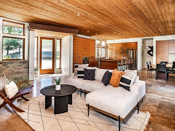 NEW PRICE! A peaceful place to call home. Nestled w/in nature's beauty, this 3 bdrm (+ office), 3 bath single lvl home located in the coveted, gated community of North Rim in NW Bend, optimizes on the desire of bringing life into a natural balance. The clever architectural design allows this prairie-style home to experience the benefits of energy-efficient living via passive solar. The open concept floor plan allows the great room to wrap around a tranquil rear crtyrd w/ beautiful shade plantings, BBQ & hot tub; perfect for outdoor meals. Guest-smart function w/ a 'guest wing' & an 'owner's wing.' Sleek SS counters + huge butcher block central island beckons family/friends to gather around, sharing stories & flavors. Gorgeous walnut built-ins for abundant storage. Guest room w/ custom Murphy bed, a light-filled crnr office. Two en-suites, 3 car garage + storage. Mtn. Modern like the town of Bend itself.