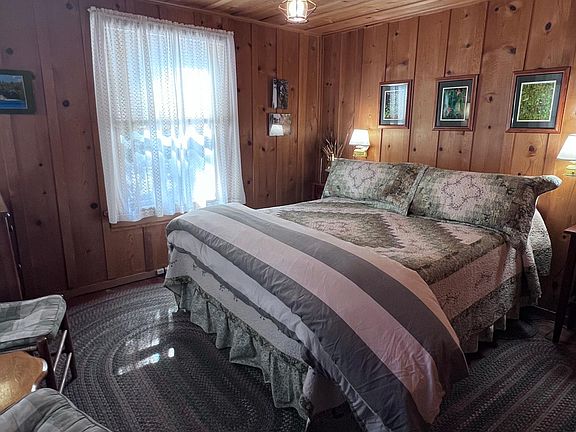 bedroom with a queen bed on this main living level, a full ensuite bath with newly tiled shower with a