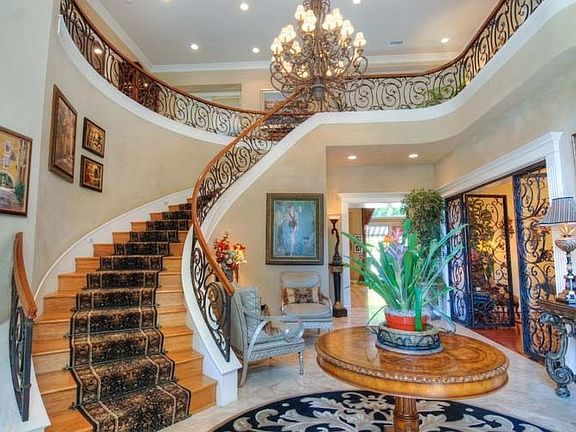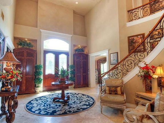 Elegant Med. estate designed by Ron Firestone, blt by Brookside Prop. w/finest quality thru-out.In the heart of No. Ranch & setback amidst ancient oaks.Hedge lined stone walk way leads you to the double door entry. Grand foyer w/voluminous ceilings, limestone flooring & sweeping grand iron staircase.Wrought iron doors open to home theatre or what was once a library. Another matching set of wrought iron doors open to the beautiful LR w/marble FP & pecan floors. Formal DR is spacious & light filled w/an adjoining oversized butler's pantry. Perfect for holiday festivities.Charming powder room features Venetian plaster & furniture quality vanity. FR w/hardwood floors, pub bar, wine fridge, huge stone FP. Gourmet's kit.w/breakfast bar, Viking