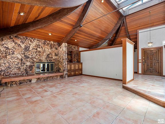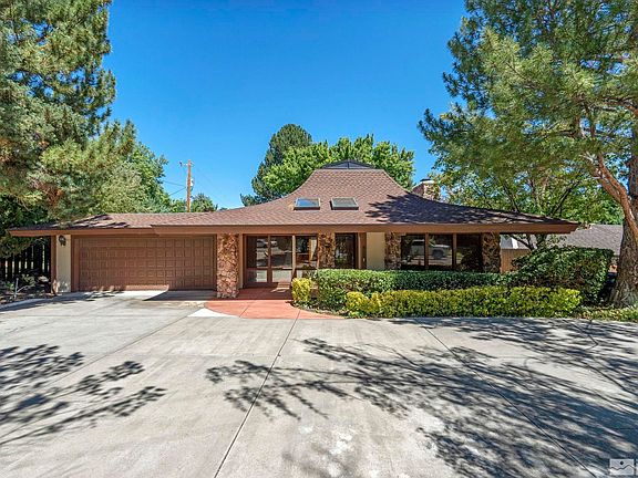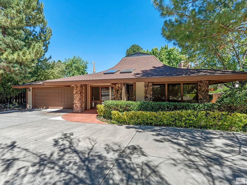 Discover the charm of this stunning custom retro home located in the heart of southwest Reno. In the 70s it was awarded Reno Architectural House of the Year! From the moment you walk through the door, you'll be captivated by the soaring 16-foot high ceilings and the expansive skylight that bathes the space in natural light. With four spacious bedrooms and two beautifully appointed bathrooms, this home offers plenty of room for both relaxation and entertaining., Step through the sliding glass doors to a serene backyard, where a charming stone pathway leads you through diverse landscapes to the back of the property. The thoughtfully designed patio features a walk-up bar conveniently situated just below the kitchen, allowing the chef to stay engaged with guests while preparing meals. Here, you'll find an enchanting custom garden house with a glass door—perfect for use as a greenhouse, pottery studio, or additional outdoor storage. The U-shaped driveway provides ample parking, complemented by a two-car garage for added convenience. This one-of-a-kind home is a rare gem—don't miss your chance to make it yours today!