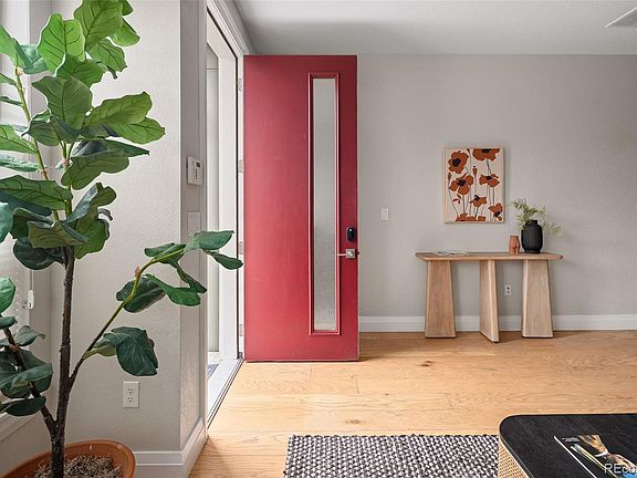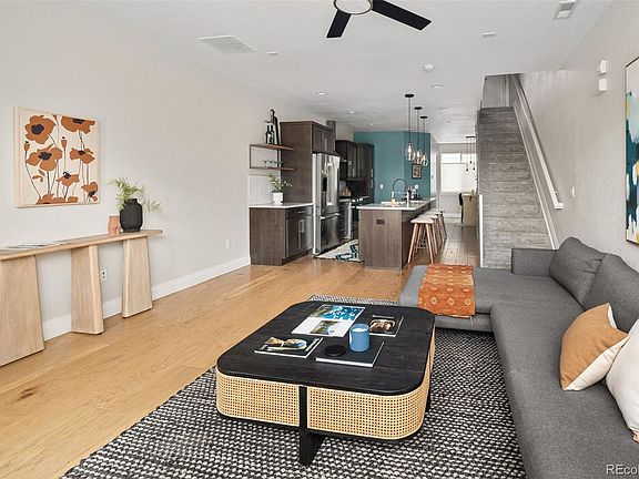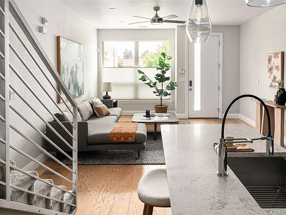 Beautifully updated 3 bed, 3.5 bath townhome just 1.5 blocks from Sloan’s Lake. This spacious home features NEW carpet, a colorful powder bath, lighting, modern ceiling fans, curtains, and fresh sod in the front yard. The open-concept main level offers a seamless flow between living, dining, and kitchen. The main floor has tall ceilings, real wood floors, stainless steel Bosch appliances, a large quartz countertop island complete with a farmhouse sink. Each bedroom includes its own ensuite bath for added comfort and privacy. Enjoy outdoor living with a small, fully enclosed front yard and a rooftop deck offering views of the city skyline. A detached 2-car garage can be accessed through a private breezeway, providing secure parking and custom overhead shelving for additional storage. Conveniently located near Edgewater Marketplace, Adelitas Cocina Y Cantina, Odell Brewing, Alamo Drafthouse, Stoney's Bar and Grill, ChoLon, The Patio at Sloans and so many more shops, restaurants, and public transit. This is urban living at its best in one of Denver’s most desirable neighborhoods. These units have a party wall agreement, there is NO HOA.