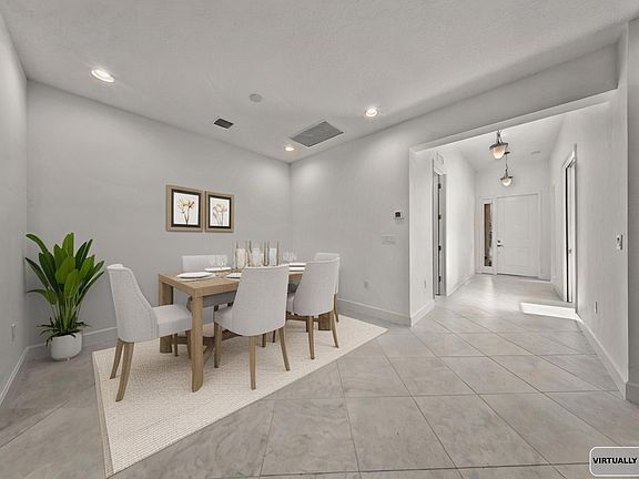 Step into this Sandpiper model with 1,760 living space under air, 2 bedrooms + office/3rd bedroom with pocket doors, and 2 baths. Corner lot with added Clusias for full privacy with fencing and screened patio. Upgrades include diagonal tile, recessed lighting throughout, impact windows, marble windowsills, full gutters, and extra TV hookups inside and on patio. Kitchen with pantry, finished back panel of island with added GFI. Primary suite features 2 walk-in closets, dual sinks, tiled-to-ceiling shower. Guest bath also tiled to ceiling. Laundry room with sink. Valencia Grove offers world-class 55+ amenities: clubhouse, resort pool with cabanas, fitness, pickleball, tennis, and endless social events. Move-in ready with security system.