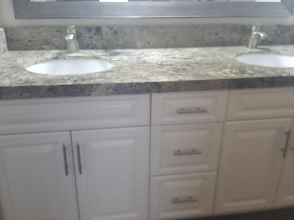 Granite kitchen counter topWhite custom kitchen cabinetSouthern exposurePlantation shutters