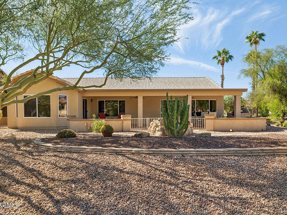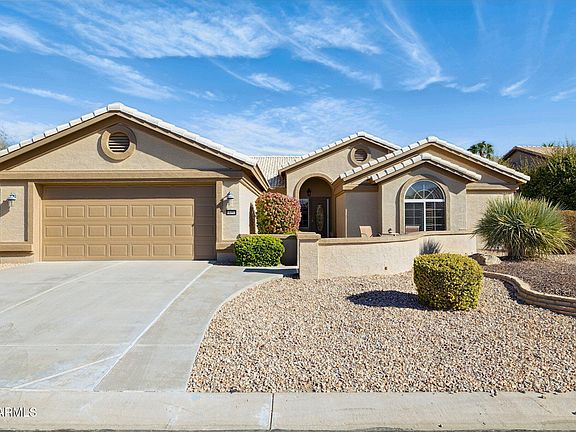 MUST SEE! Well cared, expanded Topaz model with modified floor plan & BRAND NEW ROOF 09/25. Property is located on large premium common area lot with fantastic views! Home offers comfortable living with vaulted ceilings, ceramic tile floors in all the right places, silhouette window treatments & ceiling fans throughout. Significant property upgrades include flat roof replaced (2023), exterior painted (2023), 16 SEER AC & furnace installed (2021) & irrigation lines replaced (2021). Spacious kitchen was customized at build with open-concept layout. Highlights include warm wood cabinets, newer black stainless steel appliances, large breakfast peninsula, Caesarstone countertops, chef desk, eat-in dining nook, & plenty of storage throughout. Family room features beautiful media wall with prewired surround sound, additional oversized window for extra light and panoramic lush green views.