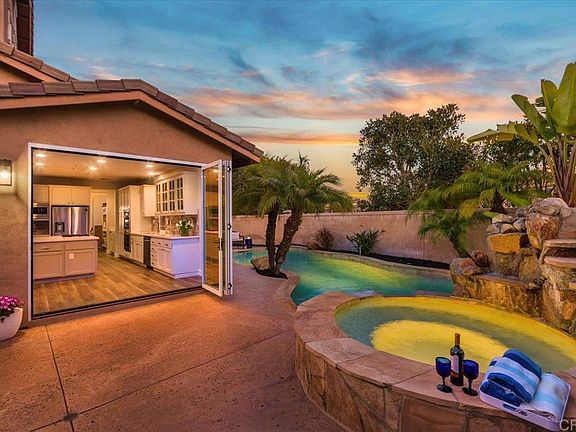 STUNNING POOL & SPA HOME IN CARMEL NEIGHBORHOOD OF SAN ELIJO HILLS! This wonderful 3,140 sq.ft. home boasts 5 Bedrooms plus optional 6th Bedroom /play room/ office and 3.5 bathrooms situated on a spacious corner lot. Enjoy indoor-outdoor entertaining with new La Cantina doors in the family room and kitchen leading to a backyard paradise: resort-style pool & spa with rock slide and waterfall, outdoor kitchen with BBQ, cozy fire pit, gorgeous tropical landscaping and lawn. Beautifully remodeled gourmet white kitchen featuring quartz counters, stainless steel appliances including double oven, huge center island and butlers pantry. The fantastic floorplan has a large bright primary suite with additional 3 bedrooms/ 1 bath plus office nook upstairs, while the first level features an oversized bedroom with ensuite bath in addition to the optional 6th bedroom (office/media room). Beautiful interior features include high ceilings, luxury plank flooring downstairs, stacked stone fireplace in family room, newer carpet, custom backsplash, plantation shutters, dual AC, recessed lighting, crown molding & more! This home is a must see and a short walk to schools, parks, trails and the San Elijo Hills town center. SAN ELIJO HILLS COMMUNITY is an award winning community. Neighborhood amenities include: desirable schools, ballparks, soccer fields, picnic tables, BBQ areas, playgrounds, dog park, community center + a pedestrian friendly town center in just a short walk distance. Enjoy 18 miles of trails & 19 acre park + 1000 acres of open space. Room dimensions & square footage are approximate, per builder & assessor's record.