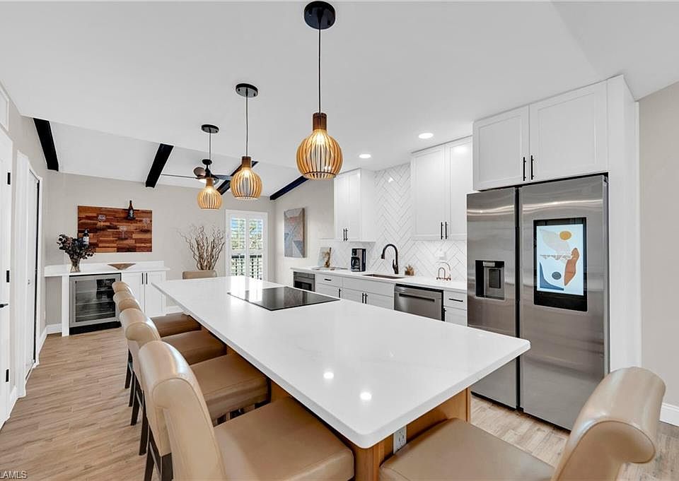 Welcome to paradise living at Windward Way Condos in Fort Myers! This BEAUTIFULLY REMODELED TOP FLOOR END-UNIT offers modern comfort and coastal charm just minutes from Fort Myers Beach and Sanibel Island. Featuring two bedrooms, two full bathrooms, and a versatile sunroom with a Murphy bed, this FULLY FURNISHED condo is ideal for full-time living, a seasonal getaway, or a rental investment—with NO RENTAL RESTRICTIONS. Windward Way condos are VERY RARELY AVAILABLE. The interior showcases quartz countertops, a massive island, modern stainless steel appliances, soft-close cabinetry, under-cabinet lighting, and an extra wine refrigerator in the kitchen. The great room’s vaulted ceiling, plantation shutters, and ceramic tile flooring create an open, airy feel. Enjoy sunset and water-fountain views from the southwest-facing sunroom sliders or gather with friends on your oversized private front porch. The primary suite features a marble tile shower with frameless glass door, while the guest bath includes a marble tile surround and tub. Additional highlights include impact-rated sliders, five high quality ceiling fans all with dimmable lights, and a newer washer and dryer in-unit. Recent updates provide peace of mind: a 2025 water heater and a 2022 A/C. The building’s 10-year milestone inspection has been successfully completed and the community has received all new landscaping. Residents enjoy a community pool, spa, pickleball and tennis courts, shuffleboard, water-fountain pond, and ample guest parking. Includes one covered carport space, a private storage closet, and bike racks. This ideal location is just minutes from the beaches and surrounded by great restaurants, shops, and local attractions—perfect for enjoying the Southwest Florida lifestyle!
