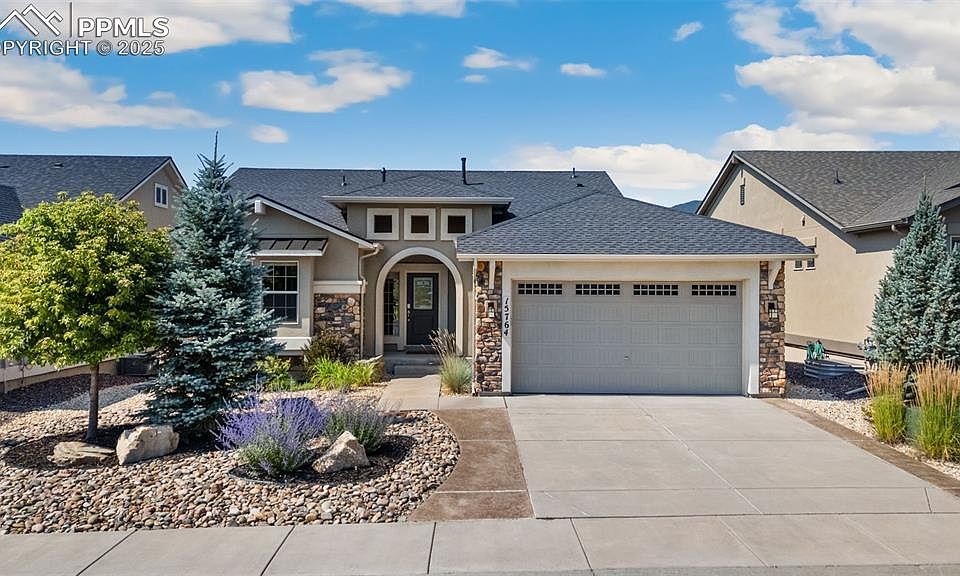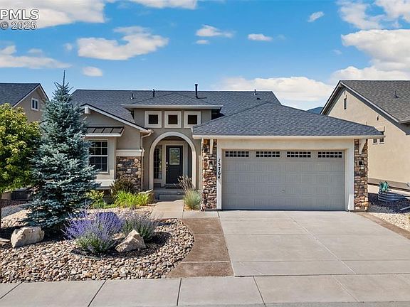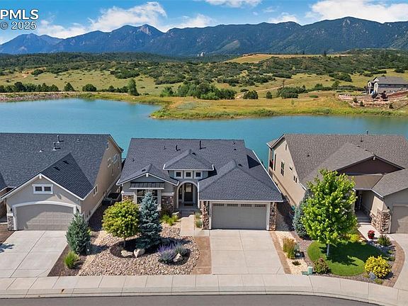 Come glimpse Waterfront Paradise with Spectacular Views of the majestic Mountain Range and the Tranquil Blue Lake front this stunning Forest Lakes Home, located on a Premier Lot backing to Pinon Lake, evoking a sense of tranquility & escape in a place where one can unwind and enjoy the Natural Beauty and year-round Resort-like Living. All the West-facing Rooms in the house, including the deck and the covered flagstone patio, Offer Sweeping, Picturesque Views. This tastefully designed, Open-Concept, elegant Ranch Home is enriched with Classy Upgrades, and looks like a Model Home. It features a Bright and Spacious Layout with 4 Bedrooms, 3 Bathrooms, and a Main-Level Office with French Doors. The Main Floor Exquisite Great Room features a Stone Fireplace, Luxury Vinyl Flooring, a Wall of Windows, and a Walkout to an incredible Deck for relaxing or entertaining. Gourmet Kitchen features Granite Countertops, a Tile Backsplash, a Center Island with a Breakfast Bar, a Gas Range, and a Pantry. The magnificent Primary Suite features Sweeping Views from the Bed, a door to the Deck, an Adjoining Bathroom with Walk-in Spa Shower, a Double Vanity, a Walk-in Closet, and an adjoining Laundry Room. The wonderful Walk-out Basement is perfect for Family Fun & Entertaining, featuring a generous 28’x17’ Family Room complete with a Stone Fireplace and a Wet Bar. Additionally, there are Two Bedrooms, a spacious Flex Rm or BR & a Full Bath. Step outside on the large Flagstone Patio, where you can stargaze & enjoy the Peaceful Ambiance created by the Water Feature and the Lake. The oversized 2-Car Garage has a 4-foot extension for a workbench area. The Xeriscape Yard is gorgeous. There are two 50-gallon Water Heaters & a New Roof in 2023. Forest Lakes has an extensive Trail System & Community Lakes where residents can Fish, Kayak, and Paddleboard. This home offers the best of both worlds – a Private Oasis with easy access to the essentials of everyday life & I-25, at an Incredible Price.