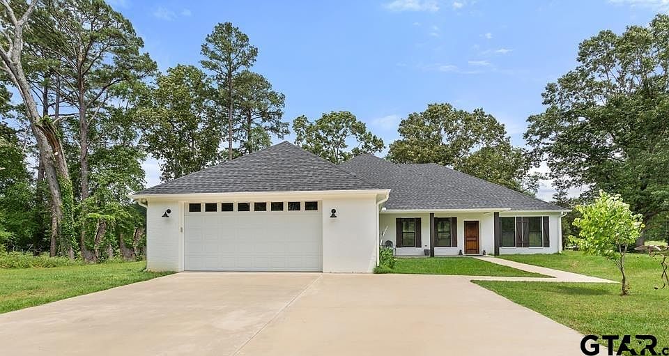 Newly built modern farmhouse lakefront home with privately owned shoreline on East Lake Tyler! This 2,408 square foot property on nearly an acre and a half is pretty dreamy. As you enter you'll notice the polished concrete floors, wood fireplace surround for the wood burning fireplace, open concept, high ceilings, and a view of the lake where you can watch boats float by daily. Kitchen has granite countertops, tile backsplash, designer range good, a gas cooktop range, dishwasher, island, and breakfast bar. Dining area overlooks the water, green hillside, and trees--so pretty! Laundry room is off the kitchen and has a chute to drop your laundry from the primary closet. Owner's retreat truly feels like a retreat. Spacious room has tray ceiling. Bathroom will give you the spa treatment with double vanity, soaker tub, walk-in separate shower, storage, and a huge closet. On the opposite side of the house you will find two nice-sized bedrooms, and a large guest bath with shower/tub combo and plenty of room to get ready. Covered patio is the perfect spot to sit and watch the boats go by. Water is provided by a private well with a whole house water filtration system. With over an acre you have plenty of elbow room. Well-maintained home. Two car garage. All this one needs is you!