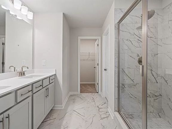 The primary suite has a large tile shower, dual vanities and tons of closet space.